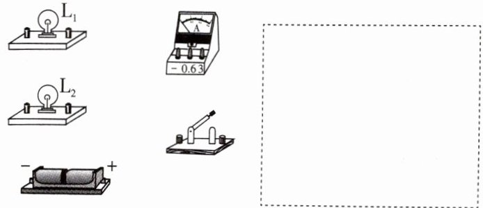 7. 请用笔画线代替导线,连接如图所示的实物电路。要求:开关同时控制两灯,灯$L_{1}$、$L_{2}$并联,电流表测量通过灯$L_{1}$的电流,并根据实物图在虚线框内画出电路图。