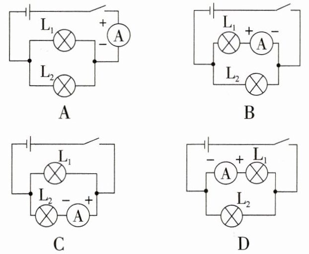 D 解析A中,电流表测量干路电流;B中,电流表的正、负接线柱接反了;C中,电流表测量通过灯L₂的电流。故选D。
