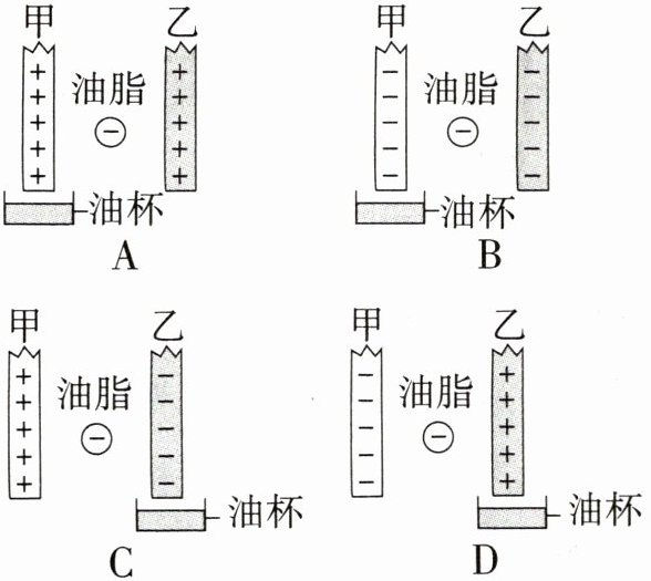 1.【物理与生活】厨房油烟中含有水汽、空气和油脂液滴等,直接排放会污染空气。抽油烟机可有效减少厨房油烟污染,其中"静电分离"技术可让甲、乙金属板和油脂液滴分别带上电荷。当厨房油烟由下往上从两金属板间通过时,空气和水汽不带电可顺利通过,而带电的油脂液滴会被一侧的金属板吸附,并流入下方的油杯。下列关于金属板所带电荷及油杯位置符合要求的是 ( )