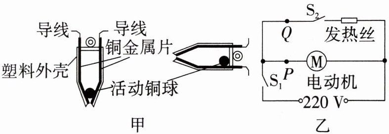 9.为了安全,冷暖风机都装有跌倒开关S,如图甲所示。当风机正立时,跌倒开关里的活动铜球使电路连通;当工作中的风机跌倒时,活动铜球能切断整个风机电路。冷暖风机的电路如图乙所示(跌倒开关S未画出),下列说法正确的是 ( )