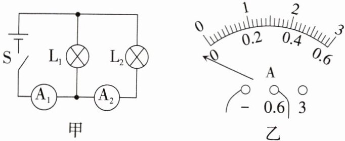 15.小宇利用课余时间做"用电流表测电流"的实验,连接的电路如图甲所示。闭合开关前,电流表$A_2$的指针指在如图乙所示的位置,其原因可能是______。调整之后,当闭合开关试触时,发现电流表$A_1$的指针指到如图丙所示的位置,于是他立即断开开关,接下来他应该进行的操作是______。改正错误后,当开关S闭合时,电流表$A_2$的指针偏转情况如图丁所示,则通过灯$L_2$的电流是______A。
