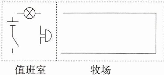 13.实践小组为牧场设计了一个自动报警电路。首先用导线将整个牧场围起来,在正常情况下值班室内的灯亮;若有牲畜撞坏牧场围墙,导线被拉断,值班室内的灯亮且电铃响。请按要求完成虚线框内的电路图。