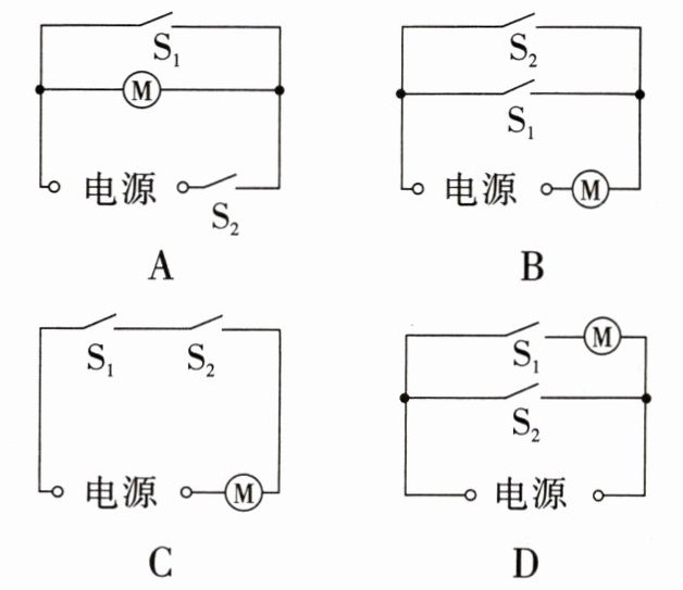 11.为了保障安全,滚筒洗衣机内设置了电源开关$S_1$和安全开关$S_2。$当洗衣机门关上时$,S_2$自动闭合,再闭合电源开关$S_1,$洗衣机才能正常工作。下列简易原理图符合要求的是 ( )