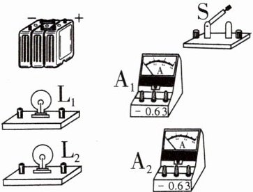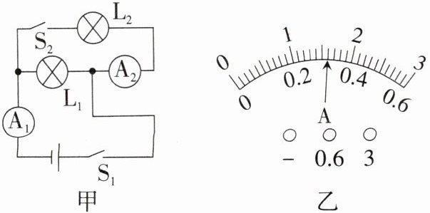 18.在"用电流表测电流"的实验中,某同学按如图甲所示的电路图连接实物图。开关都闭合后,两灯都发光,两个电流表指针所指的位置均如图乙所示,则通过灯$L_2$的电流为______A,通过灯$L_1$的电流为______A。若$S_2$断开,电流表$A_1$的示数______(选填"变大""不变"或"变小")。