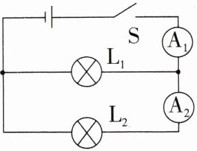 (2)他先将电流表接在A处,闭合开关后,观察到灯$L_1$发光,灯$L_2$不发光,电流表有示数,电路存在的故障可能是______。