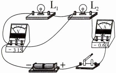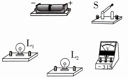 10.请用笔画线代替导线完成电路连接。要求:灯$L_1、$$L_2$串联,电压表用合适的测量范围测量灯$L_2$两端的电压。