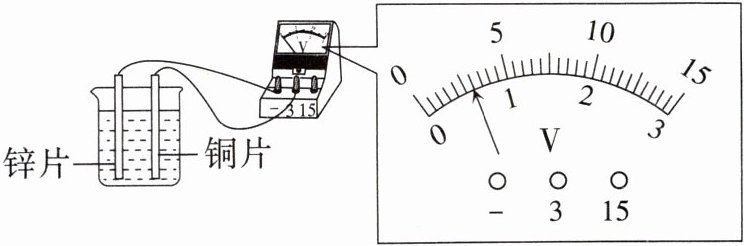 8.小聪将锌片和铜片浸在浓盐水中制成一个电池,电压表的示数如图所示。关于此电池,下列说法正确的是 ( )