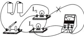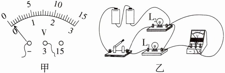 (2)如图乙是小芳测量灯$L_1$两端电压时连接的电路,同组的小红发现连线中有一处错误,而且只需改动一根导线,就可以顺利进行实验。请在需要改动的导线上打“×”,并画出正确的接线。