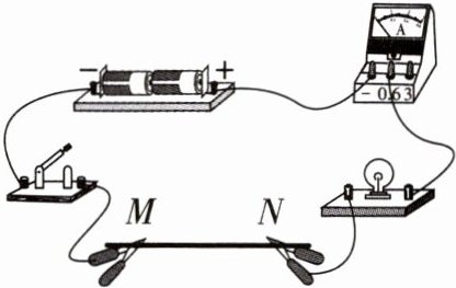 2. 小明利用铅笔芯和鳄鱼夹制作了简易调光灯,装置如图所示。电路中有一处明显错误是______;改正后,闭合开关,改变鳄鱼夹M、N之间距离,发现灯泡亮度会发生变化,鳄鱼夹与铅笔芯组合在一起相当于一个______。