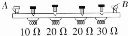 解析:当铜塞插入时,该铜塞处的电阻丝被短路,由图可知,拔出的铜塞所对应的电阻是20Ω + 30Ω = 50Ω,所以此时电阻箱的有效电阻是50Ω。当铜塞全部拔出后,总电阻最大,它们的总电阻R = 10Ω + 20Ω + 20Ω + 30Ω = 80Ω。