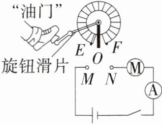 11. 【物理与生活】电动汽车中电动机的转速由电流大小控制,其工作原理如图所示。利用旋钮变阻器实现对转速的控制,图中O、E、F为变阻器的三个接线柱。驾驶员踩下“油门”,电路中变阻器接入的电阻减小,电流变大而加快电动机的转速,用笔画线代表导线将旋钮变阻器接入电路M、N处。