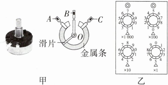7. 电位器是电器设备中常用的电路元件(如图甲),已知音响设备中的电位器接入电路的电阻越小,音量越大,若要实现沿逆时针调节旋钮时,音量增大,必须将B和______接入电路。如图乙是电阻箱,此时接入电路的电阻示数是______Ω。