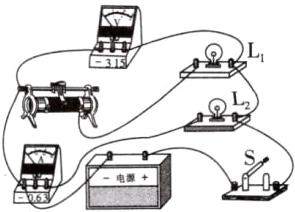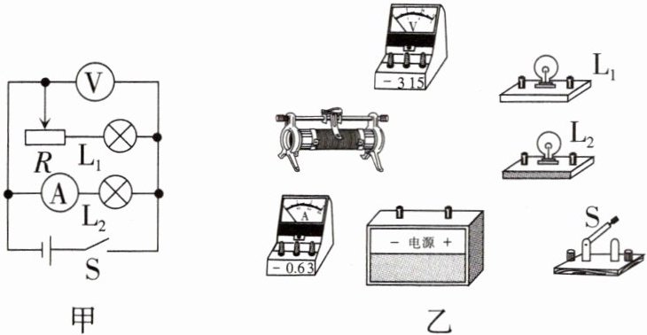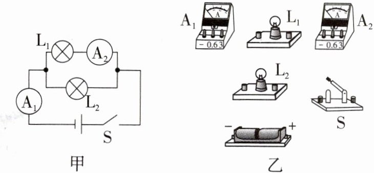 6. 如图甲所示$,L_1$和$L_2$是两个规格相同的小灯泡,闭合开关时,通过$L_1$的电流为0.32 A。请你按照图甲的电路图用笔画线代替导线完成图乙的实物图连接。