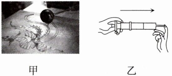 5.非物质文化遗产——画"糖人"是我国的一种民间艺术(图甲),其作画过程中糖汁连绵不断是因为分子之间存在相互作用的______。如图乙所示,用食指按住针筒嘴,然后用力推活塞,发现针筒中的液体很难被压缩,这是因为分子之间存在相互作用的______。液态蜡在凝固时,中间会凹陷下去,这说明蜡液分子间的距离比固态蜡分子间的距离______(选填"大"或"小")。