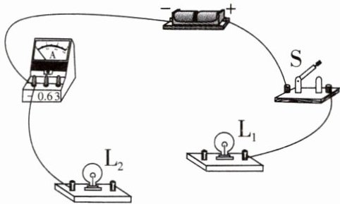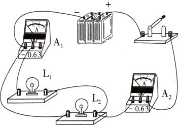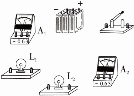 13. 现有规格相同的灯$L_1、$$L_2、$电池组、开关、两个电流表$A_1、$$A_2$等实物。请用笔画线代替导线将实物电路连接完整。要求:①开关控制整个电路,且$L_1、$$L_2$两灯并联;②电流表$A_1$测$L_1$的电流,电流表$A_2$测干路电流。