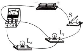 8. 如图是未完成连接的实物图,请用笔画线代替导线完成该电路的连接。要求:两灯并联,开关S在干路上,电流表只测量通过灯$L_1$的电流,导线不能交叉。(电流表选用大量程)