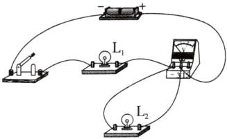 12. 在"探究串联电路中电压的特点"实验中,小明设计的实物电路如图所示,请用笔画线代替导线完成该电路的连接。要求使电压表测量灯$L_2$两端的电压。