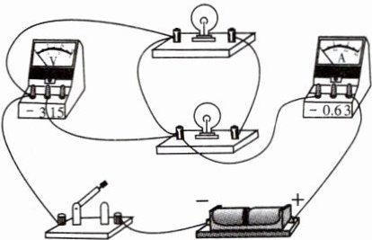 14. 小伟连接两灯并联电路的情况如图所示。当他“试触”时,发现电压表的指针不动,电流表的指针很快向右偏转,两灯都不发光。小敏指出他在电路连接中有错误,现在请只改接图中的一根导线,使电路连接正确。