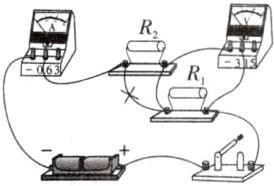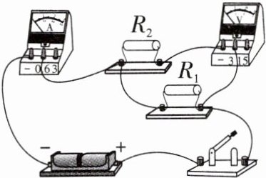 13. 请在图上只改动一根导线,使电阻$R_1$和$R_2$组成串联电路,电压表测量电阻$R_1$两端的电压。