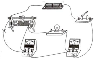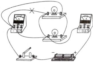 12. 小张同学在某次实验时需要“测定小灯泡两端电压和通过小灯泡的电流”,检查电路连接,他发现有一根导线连接错了,请在图中应改动的导线上打“×”,并用笔画线代替导线画出正确的接法。
