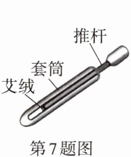 7. 【古代科技】如图是我国古代劳动人民发明的取火器的模型图,以牛角作套筒,木质推杆前端粘附艾绒。取火时,把木制推杆迅速推入牛角套筒,杆前端的艾绒立刻燃烧起来,随即将杆拔出,用口吹气立即见火苗。对于上述过程的分析,下列说法正确的是( )