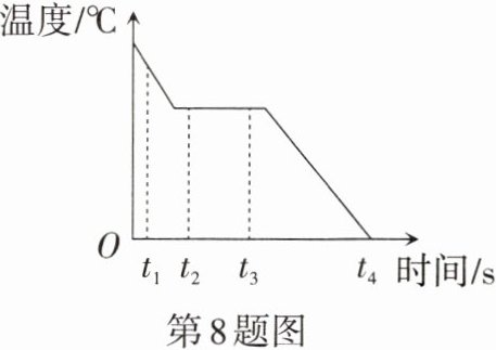 8. 如图是某物体由液态变为固态的过程中,温度随时间变化的图像。由图像可知$,t_1$时刻物体的内能______(选填“大于”“小于”或“等于$”)t_4$时刻物体的内能;$t_2~t_3$时间内,物体的温度不变,内能______(选填“增加”“减少”或“不变”)。