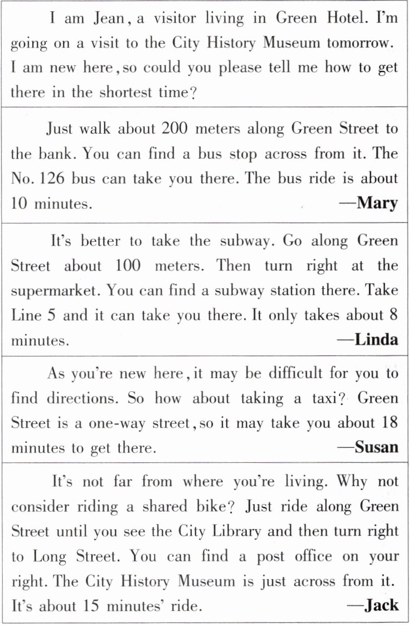 )4. How long will it take if Jean goes to the City History Museum by taxi? (