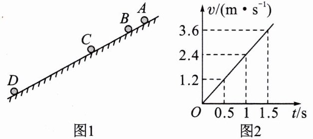 (选填“加速”“减速”或“匀速”)运动。(2)为进一步探究小球在斜面上运动的速度与时间的关系,根据所测数据作出了v-t图像,如图2所示,假设斜面足够长,小球从A处滚下,经过2s到达E点时的速度为