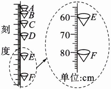 7. 在测量纸锥下落速度的实验中,小明用每隔0.5s拍摄1次的相机,拍得如图所示的照片,右侧为纸锥从E到F过程的放大图。