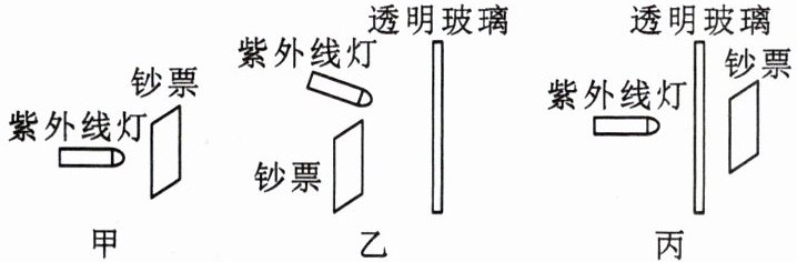 。(3)如图丙所示,他把这块透明玻璃放在紫外线灯和钞票之间,让紫外线灯正对玻璃照射,在另一侧无论怎样移动钞票,“100”字样都不发光。他做这次实验是为了探究