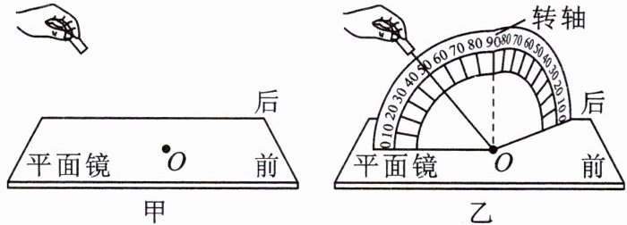 (1)将平面镜置于水平桌面,如图甲所示。激光笔的光束射向平面镜上O点,在平面镜上方喷水雾,从前向后观察,可在镜面上方看到