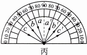(3)保持入射点不变,多次改变入射方向,在光屏上记录每次实验的光路aa'、bb'和cc',如图丙所示。为了研究反射光线和入射光线的位置关系,发现左、右半屏相对应的光线关于转轴对称,可将此对称轴视为