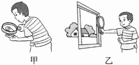 (选填"实"或"虚")像;然后他用放大镜观察远处房屋,如图乙所示。他将看到的是倒立