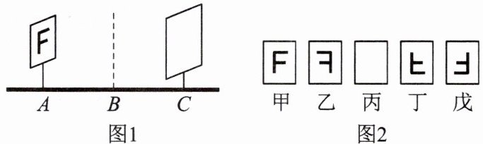 10.(安徽省中考)某小组探究平面镜和凸透镜成像的特点,将光源和光屏分别竖直放置在水平光具座上的A、C位置,B是AC的中点,如图1所示。在AB之间朝向A观察,看到的光源形状如图2中的甲所示。