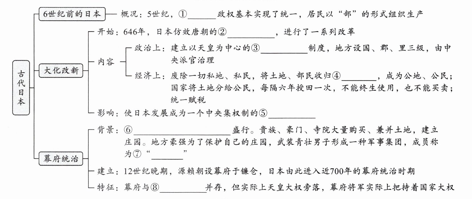 ①大和 ②典章制度 ③中央集权 ④国有 ⑤封建国家 ⑥土地私有与土地兼并 ⑦武士 ⑧天皇朝廷
