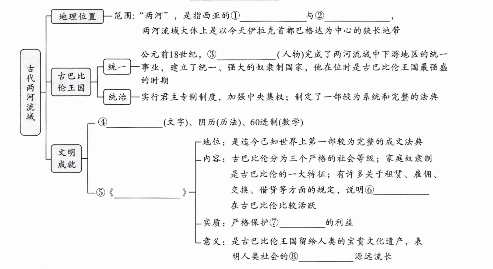 ①幼发拉底河 ②底格里斯河 ③汉谟拉比 ④楔形文字 ⑤汉谟拉比法典 ⑥商品经济 ⑦奴隶主 ⑧法制传统