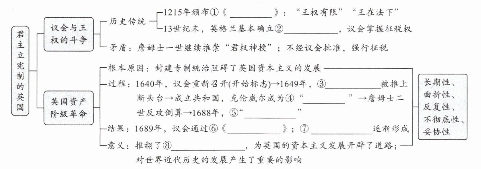 答案: ①大宪章 ②议会制度 ③查理一世 ④护国主 ⑤光荣革命 ⑥权利法案 ⑦君主立宪制 ⑧封建君主专制