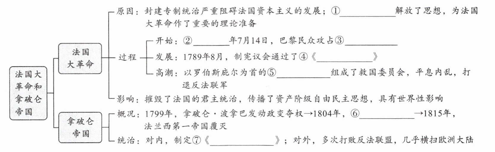 ①启蒙运动 ②1789 ③巴士底狱 ④人权宣言 ⑤雅各宾派 ⑥加冕称帝 ⑦拿破仑法典