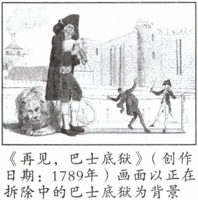 )《再见,巴士底狱》(创作日期:1789年)画面以正在拆除中的巴士底狱为背景