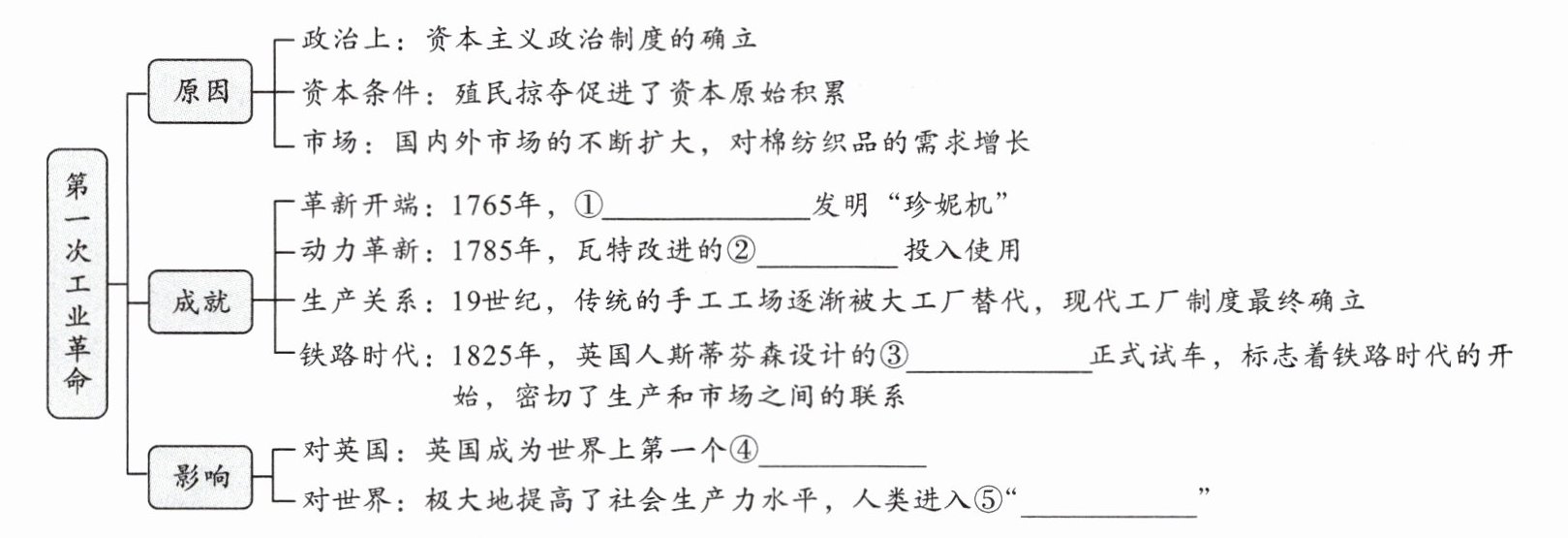 答案: ①哈格里夫斯 ②蒸汽机 ③蒸汽机车 ④工业国家 ⑤蒸汽时代