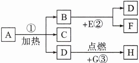 13. A~H 八种物质,有如图所示关系:其中 A 是一种暗紫色固体,B 是黑色固体,D 能使带火星的木条复燃,E、F 都是无色液体,G 是木炭,H 是一种能使澄清石灰水变浑浊的气体,在②的反应前后 B 的质量和化学性质都不改变。