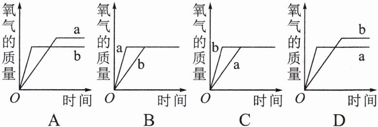10. 已知 a 为过氧化氢溶液,b 为混有少量二氧化锰的过氧化氢溶液,a 和 b 中过氧化氢溶液的浓度和质量相等。当两份液体同时反应时,能正确表示生成氧气的质量随反应时间而变化的图像是(