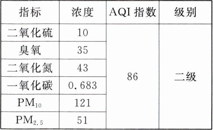 2. 空气质量指数(简称 AQI)是定量描述空气质量状况的指数,其范围是 0~50、51~100、101~150、151~200、201~300 和大于 300,分别对应国家空气质量标准中的一级(优)、二级(良)、三级(轻度污染)、四级(中度污染)、五级(重度污染)和六级(严重污染)。某日实践小组的同学们跟随环保部门的工作人员利用如图所示的微型空气质量监测仪测量本市的空气质量,并记录数据如表格所示(1mg = 1000μg),下列说法错误的是(