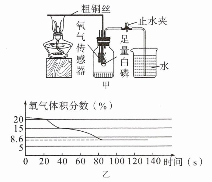 5.(数字化实验)(2024年浙江省)小金利用如图甲所示装置(气密性良好)和试剂测定空气中氧气含量;集气瓶中空气的体积为$200mL$,氧气传感器测得集气瓶内氧气的体积分数变化曲线如图乙所示。