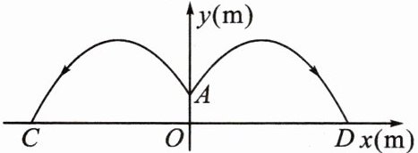 (2)当$y=0$时,$-\dfrac{1}{6}(x-5)^{2}+6=0$.解得$x_{1}=-1$(舍去),$x_{2}=11$,$\therefore$点$D$的坐标为$(11,0)$,$\therefore OD=11\text{m}$.$\because$从$A$点向四周喷水,喷出的水柱为抛物线,且形状相同,$\therefore OC=OD=11\text{m}$,$\therefore CD=OC+OD=22\text{m}$.