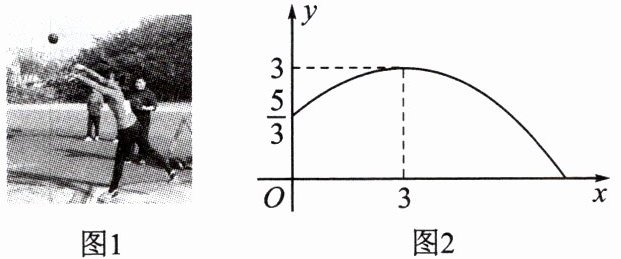 1.(兰州市中考)掷实心球是兰州市高中阶段学校招生体育考试的选考项目.如图1是一名女生投掷实心球,实心球行进路线是一条抛物线,行进高度 y(m)与水平距离 x(m)之间的函数关系如图2所示,抛出时起点处高度为$\frac {5}{3}m$,当水平距离为3m时,实心球行进至最高点3m处.