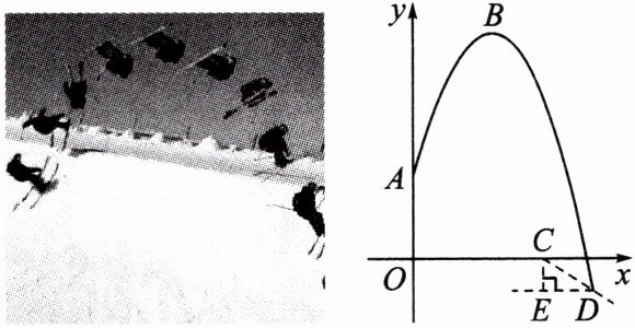 【例】(宁夏自治区中考改编)2022 北京冬奥会自由式滑雪空中技巧比赛中,某运动员比赛过程的空中剪影近似看作一条抛物线,跳台高度 OA 为4米,以起跳点正下方跳台底端 O 为原点,水平方向为横轴,竖直方向为纵轴,建立如图所示平面直角坐标系.已知抛物线最高点 B 的坐标为(4,12),着陆坡顶端 C 与落地点 D 的距离为 2.5米,若$\frac {CE}{DE}= \frac {3}{4}.$