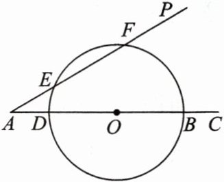 10. 如图所示,已知$\angle PAC= 30^\circ$,在射线AC上顺次截取$AD= 3\mathrm{cm}$,$DB= 10\mathrm{cm}$,以BD为直径的$\odot O$交射线AP于点E,F,求圆心O到AP的距离以及EF的长.