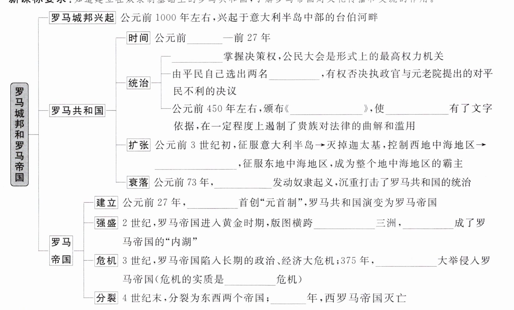 - 罗马共和国$\n$时间:公元前______—前27年$\n统治\n$掌握决策权,公民大会是形式上的最高权力机关$\n$由平民自己选出两名______,有权否决执政官与元老院提出的对平民不利的决议$\n$公元前450年左右,颁布《______》,使______有了文字依据,在一定程度上遏制了贵族对法律的曲解和滥用$\n$扩张:公元前3世纪初,征服意大利半岛→灭掉迦太基,控制西地中海地区→______,征服东地中海地区,成为整个地中海地区的霸主$\n$衰落:公元前73年,______发动奴隶起义,沉重打击了罗马共和国的统治