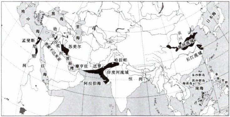 1. 跨学科 地理(2024·江苏常州)下图是一幅关于公元前2500年左右的亚非文明的地图。图中这些古代文明发生和发展的地理环境主要是( )